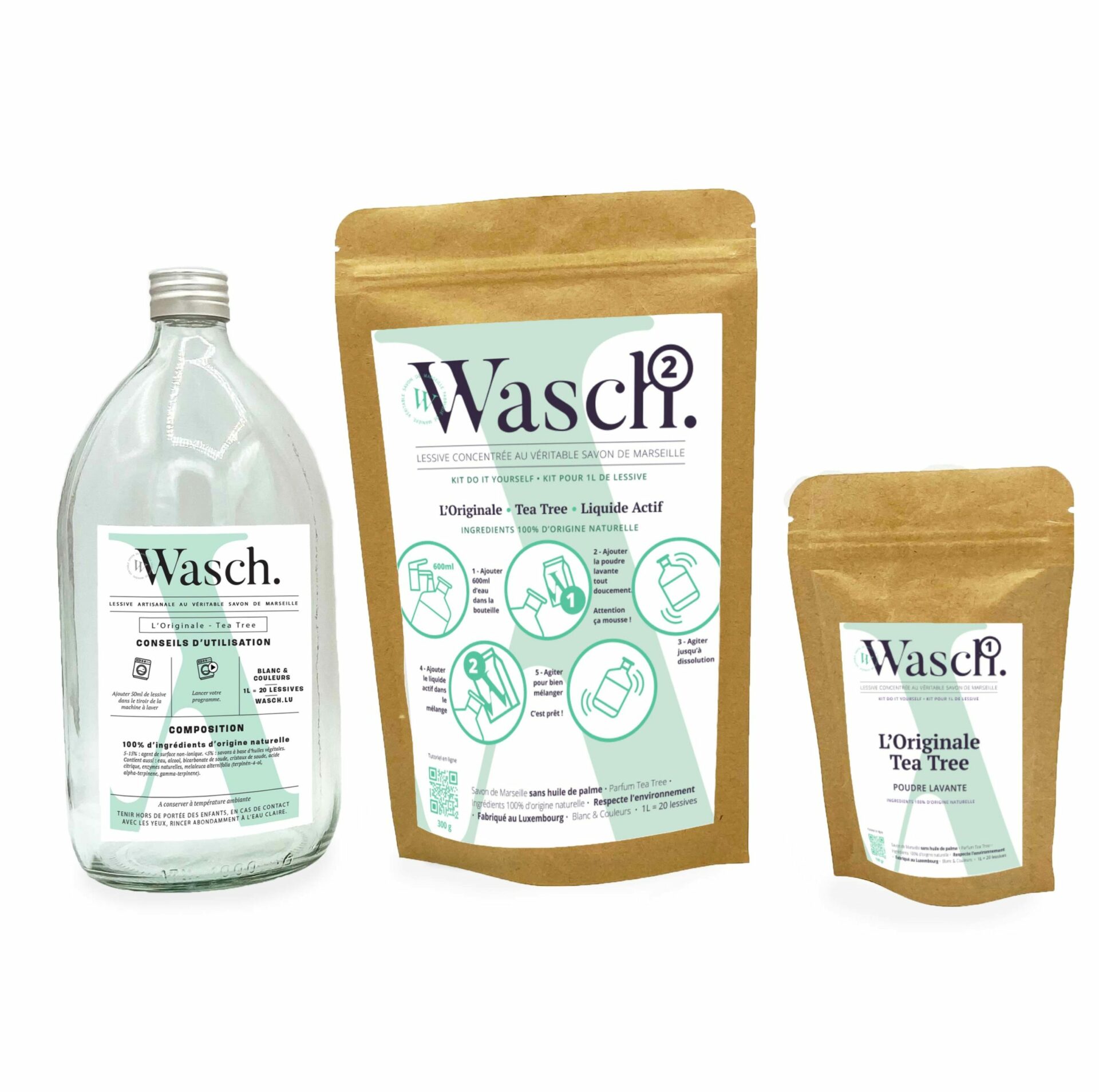 5 – 15 % : agent de surface non-ionique. <5% : savons à base d’huiles végétales, enzymes naturelles. Contient aussi : Eau, cristaux de soude, citrate de sodium, bicarbonate de soude, alcool. Peut contenir de l’huile essentielle de Lavandin ou de Tea Tree selon le parfum choisi.